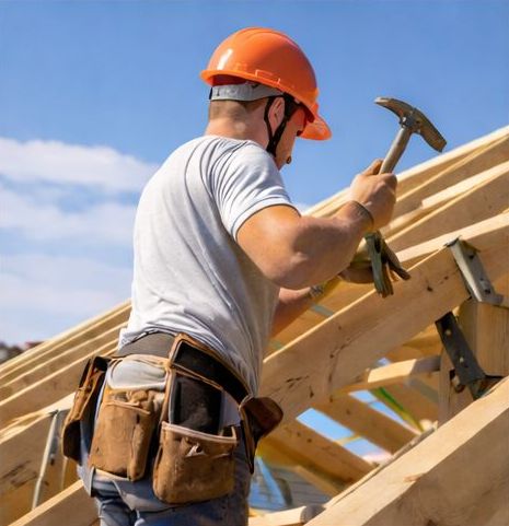 A tetőépítés során kiemelt figyelmet fordítunk a szerkezeti stabilitásra és a pontos illesztésekre.